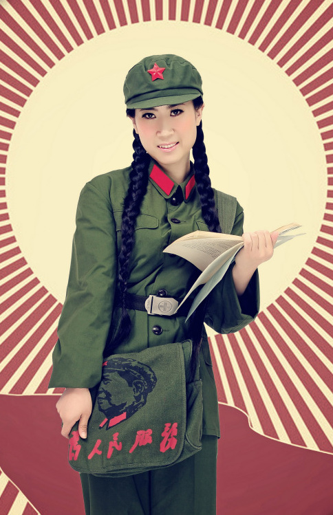 写真中芙蓉姐姐以麻花辫配绿军装的清纯造型登场,让看惯了她时尚潮流造型的网友耳目一新,脸上洋溢的纯情如水的表情别有一番韵味,芙蓉姐姐还敬军礼向伟大领袖毛主席致敬。