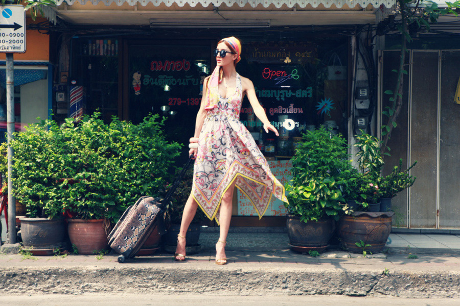 浓重的色彩、富有民族味道的印花、蛇纹皮箱、宽边草帽……所有行头被泰国的骄阳镀上一层金色,便出现了神奇的色彩氛围。时装写真大片,曼谷色彩游记。