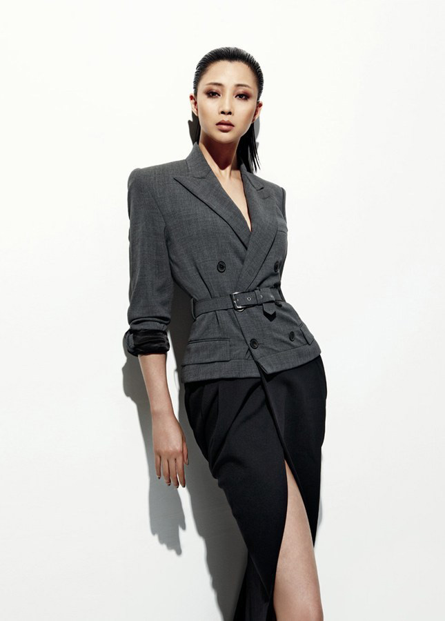 殷桃利落职场写真 灰色套装尽显OL范儿