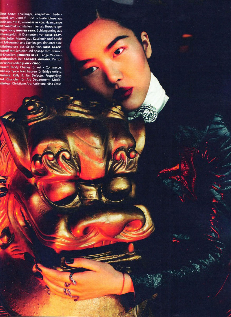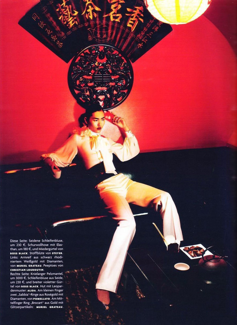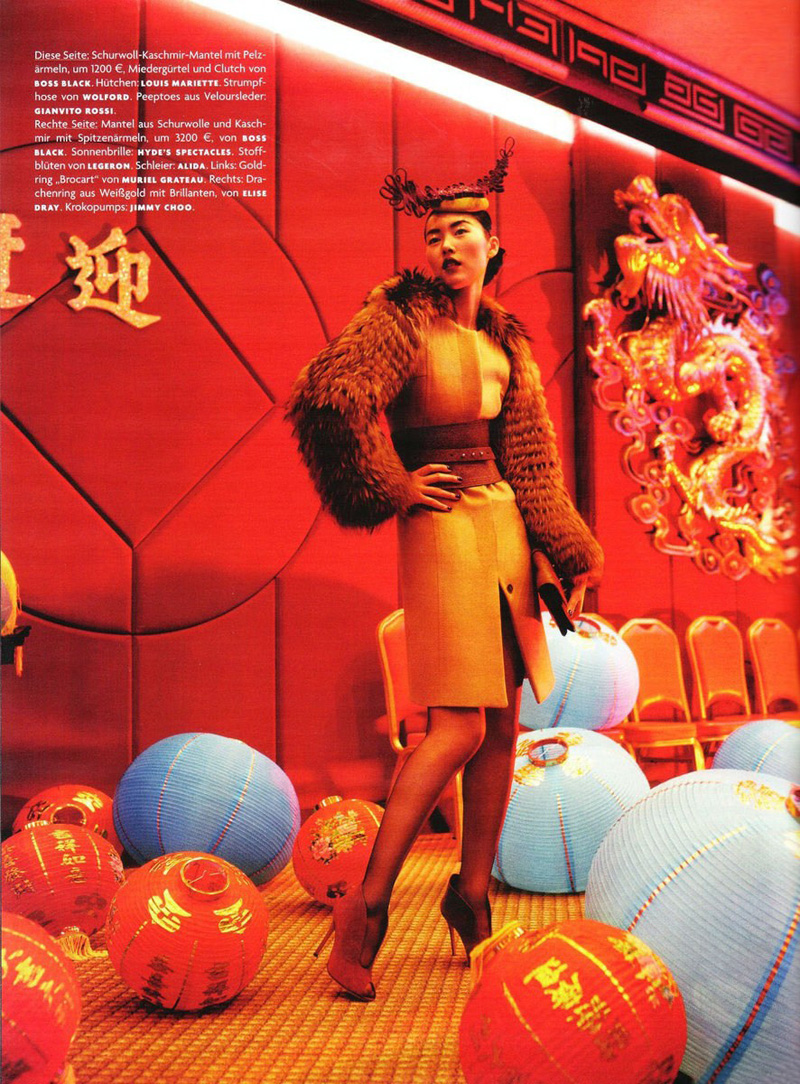 中国超模刘雯为八月号《Vogue Germany》拍摄大片“Peking Lady”,让我们再次看到老外眼中的中国。首页的文字排版+远景看上去非常《New York Time》有没有?紧接着各种把戏粉末登场:三轮车、大排档、孙中山塑像、中国书法、铜狮子,当然少不了老谋子的大红灯笼高高挂……