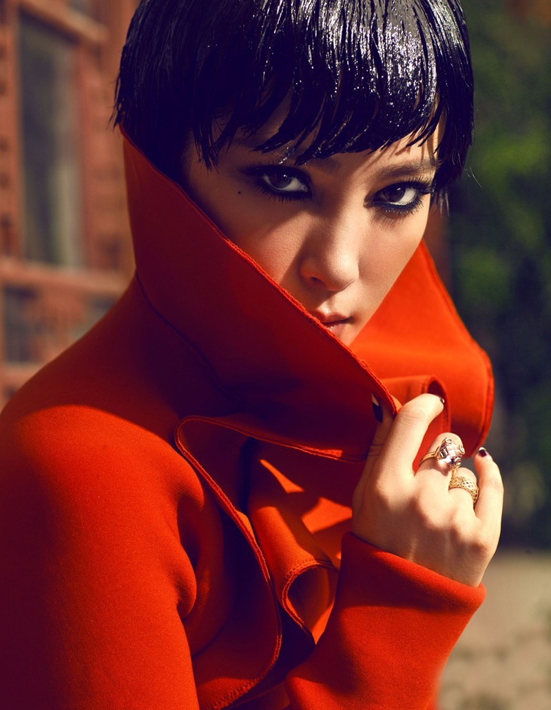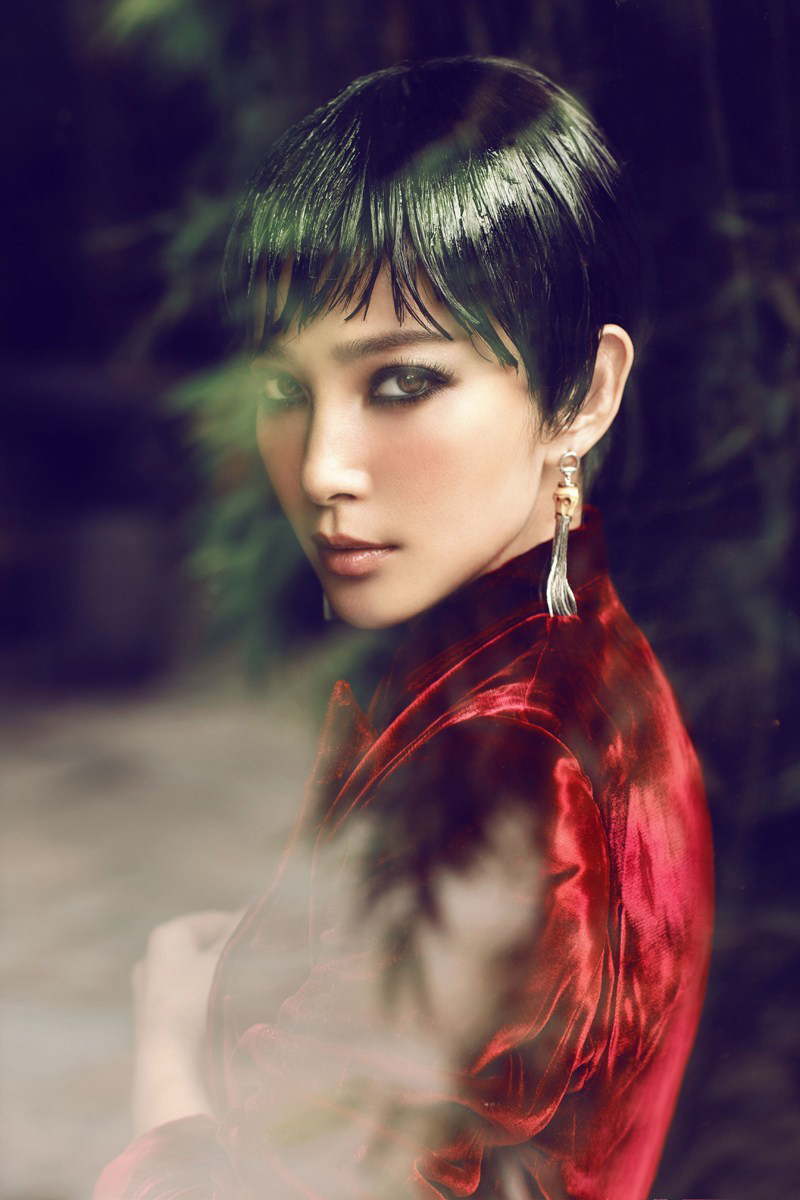 一贯以长发示人的她一改往日御姐风格,烟熏妆搭配利落短发,身穿红色立领大衣外加数把红伞,营造出视觉3D的效果,再次让人联想到影片中“艾达·王的造型,极具视觉冲击力,霸气硬朗的风格让美版《VOGUE》主编Anna Wintour盛赞为“中国式的革新”。