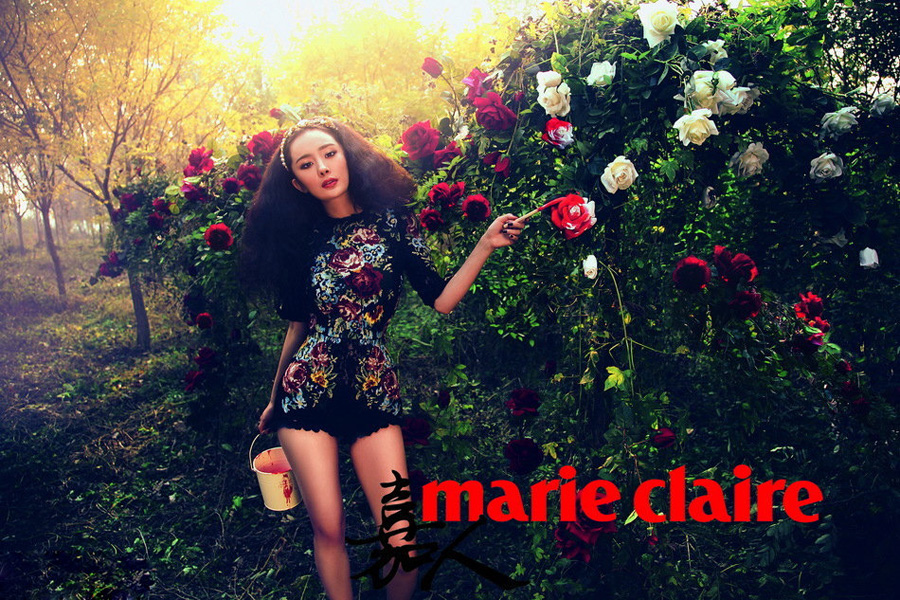 近日,杨幂为《嘉人》杂志拍摄了一组森女风大片。在这组以“爱丽丝梦游仙境”为主题的大片中,杨幂化身“爱丽丝”行走在光影奇幻的森林中,为玫瑰上色、与白云共舞。