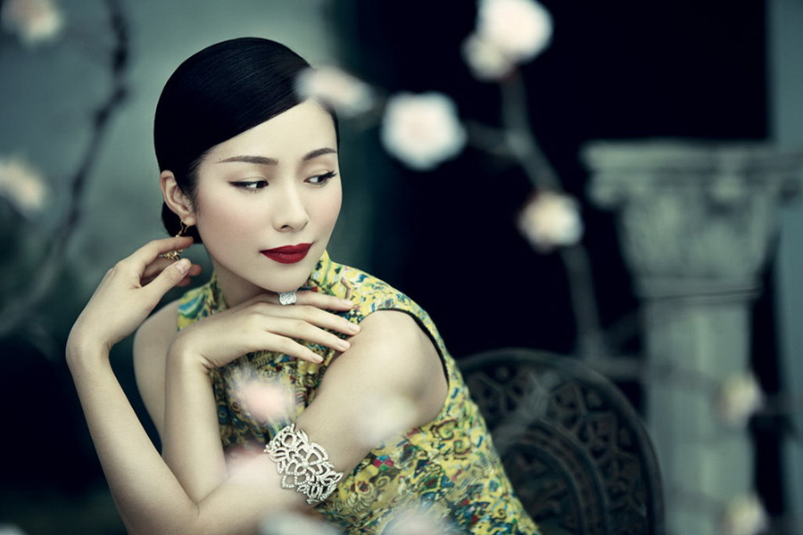 江一燕迎春写真人面桃花相映红 锦缎旗袍红唇魅惑