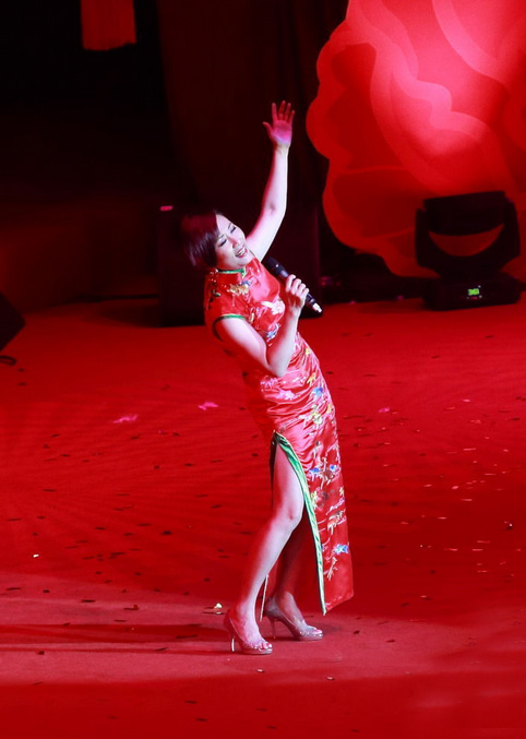 17日,汪明荃出席澳门贺年活动,66岁的汪明荃以性感高衩旗袍大唱贺年歌。