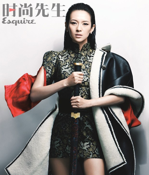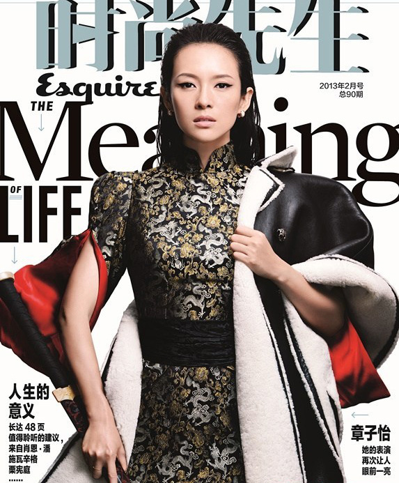 97章子怡登上《时尚先生》2月号封面,改良旗袍大秀中国风情,Loewe雪地皮革棉衣头蓬十足的西式大牌风,手中的一把盛气凌然的“青冥剑”仿佛把我们带回到了十三年前的《卧虎藏龙》那个倔强不羁的玉娇龙,这个《一代宗师》与《卧虎藏龙》完美结合的穿越式封面,绝对充满创意。