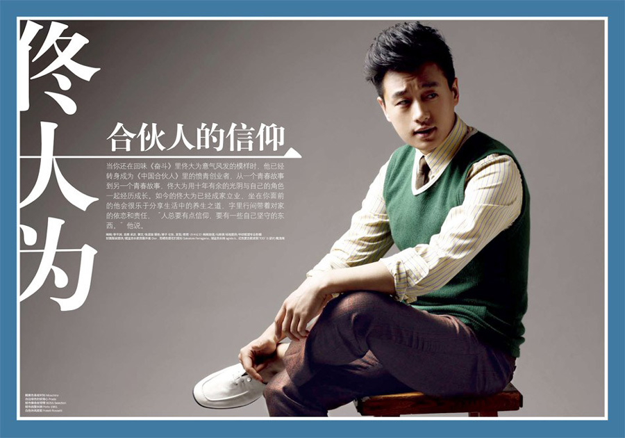 近日在时尚圈颇为活跃的演员佟大为,又为城市时尚《Let's 新城记》拍摄最新封面,动作和眉宇间张扬着一股不羁与个性,仿佛还带着其主演的电影《中国合伙人》里角色王阳愤青而又重情重义的影子。谈到新片,佟大为感慨自己获益颇多,不止和陈可辛导演“一见钟情”很有“眼缘儿