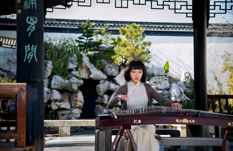 蒋梦婕《生死相依》穿白色蕾丝旗袍秀古筝
