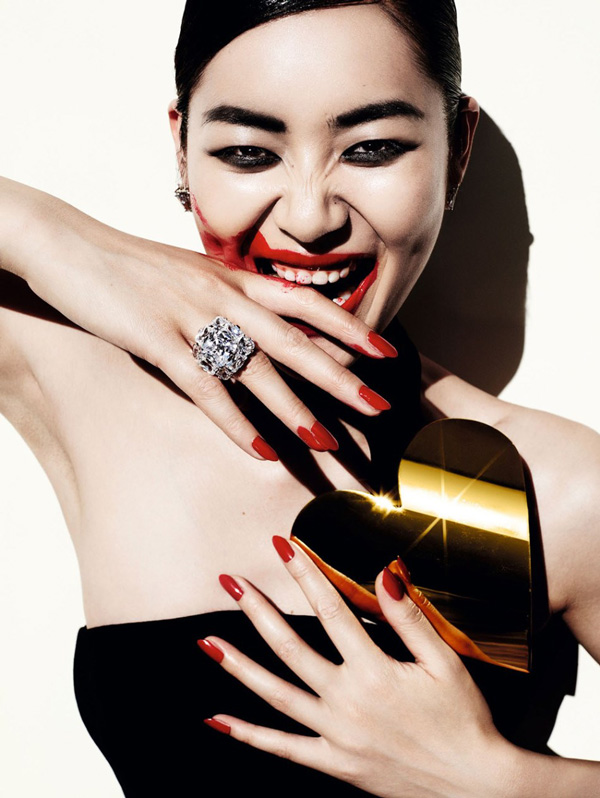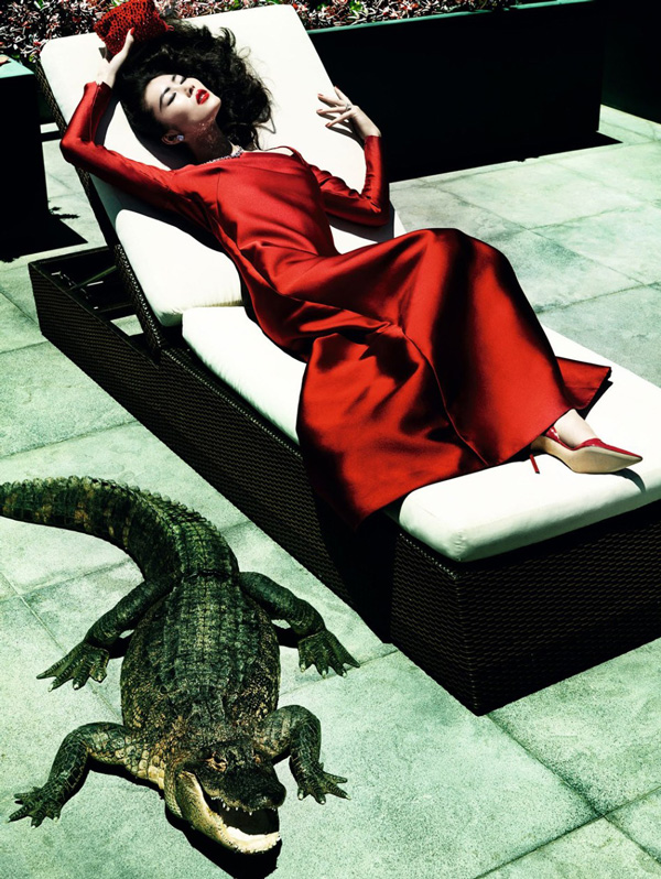 《服饰与美容 VOGUE》第100期之际,摄影大师Mario Testino首次应邀拍摄大片,片中超模刘雯狂野霸气,与鳄鱼激情共舞。