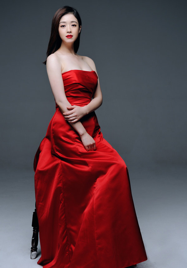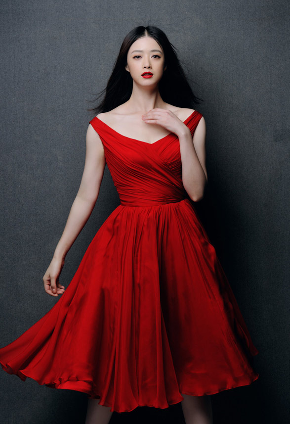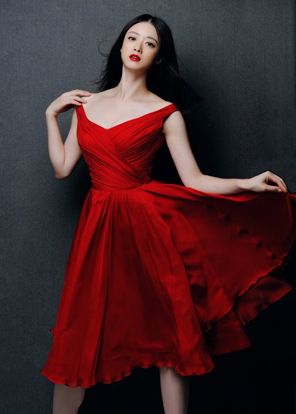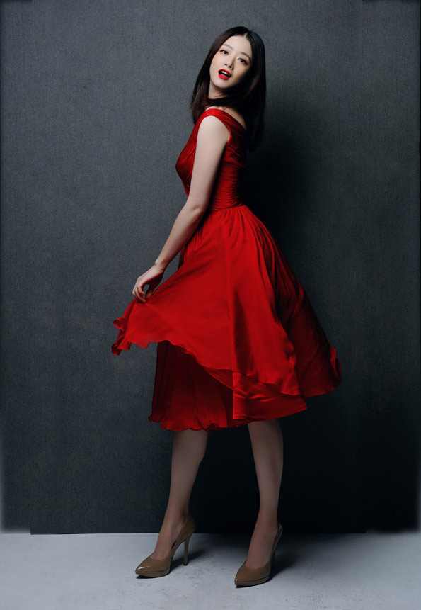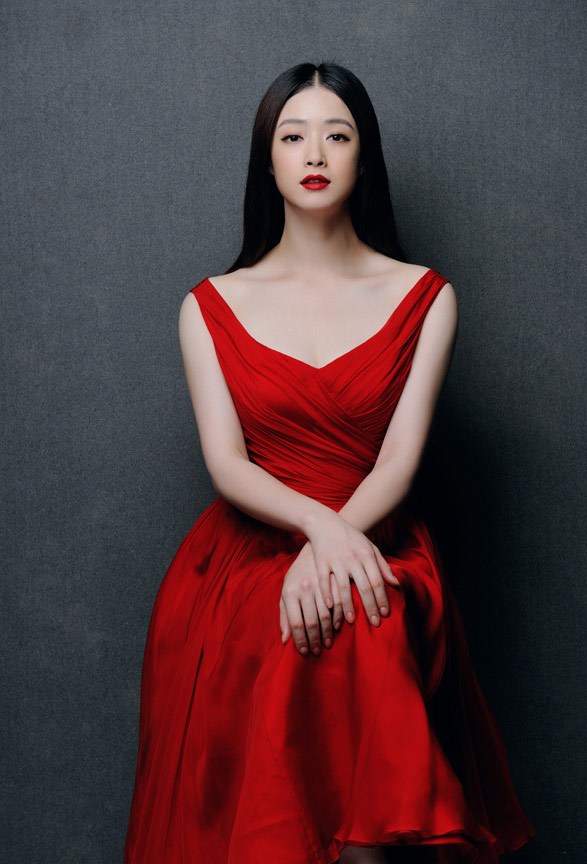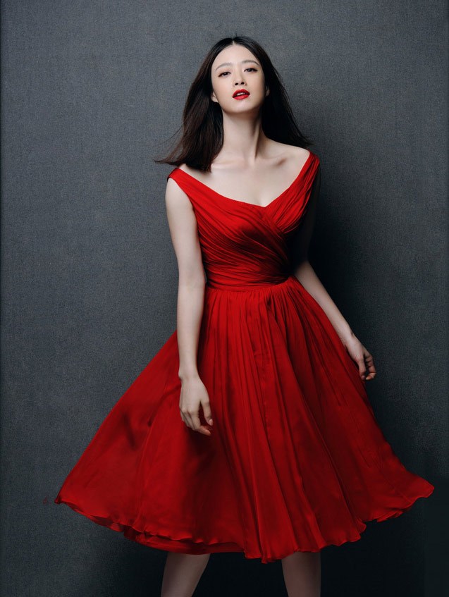 蒋欣身穿红色长裙,很符合即将春节的喜庆气氛。身穿飘逸长裙的蒋欣,十分美艳动人。