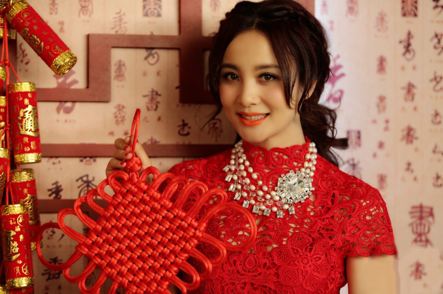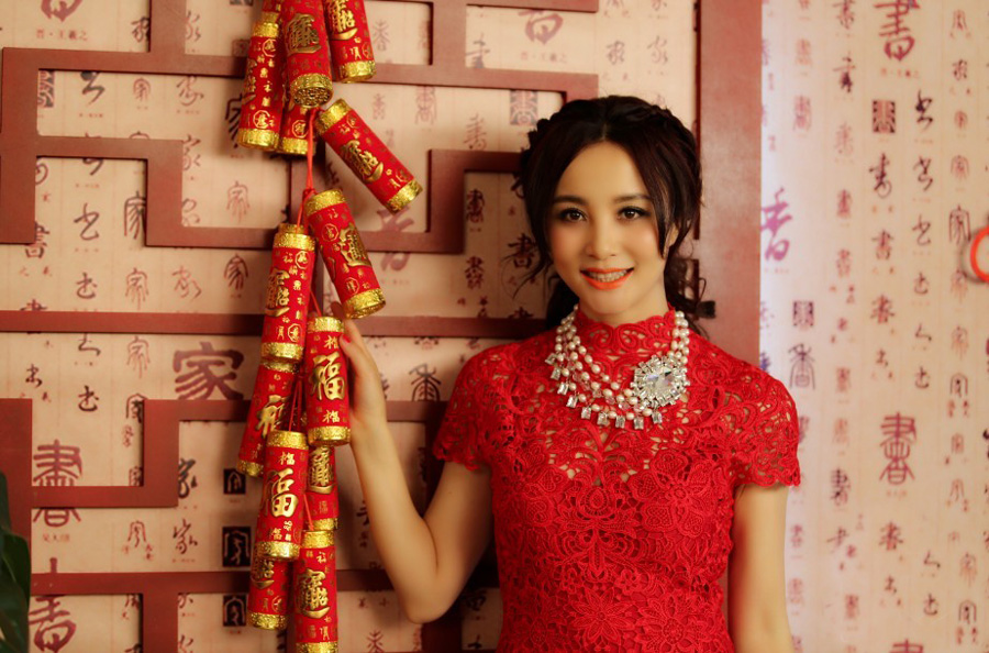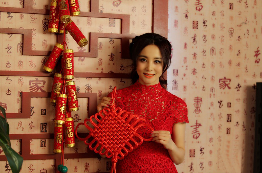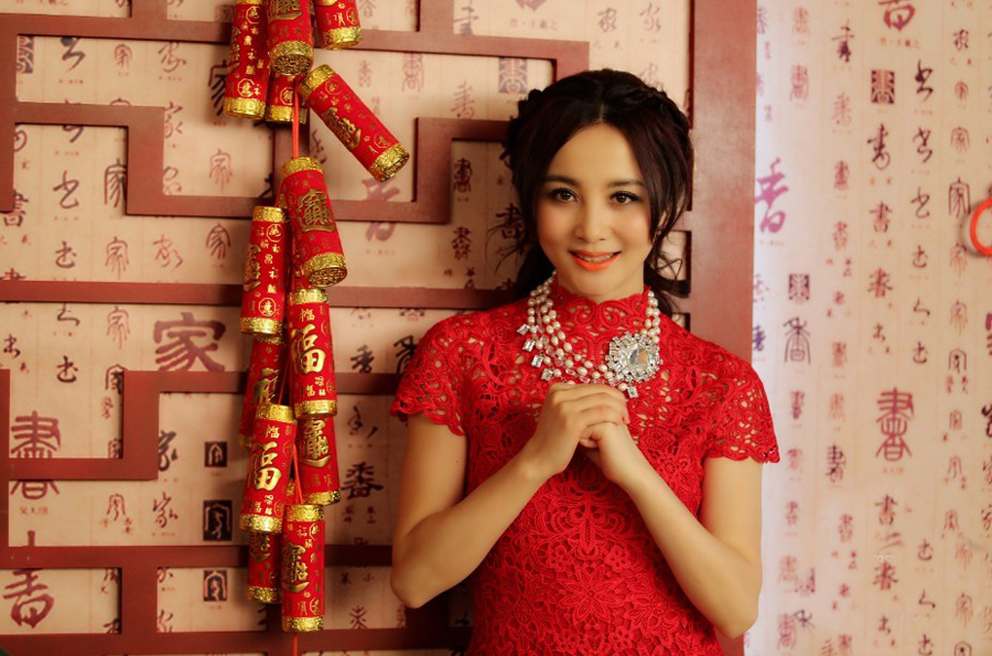 陶红镂空红火旗袍装 拜年照祝福送万家