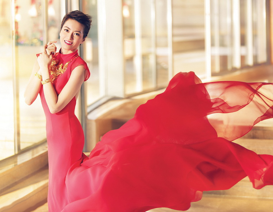 从中式红色旗袍过渡到西式白色抹胸纱裙,梁咏琪再披婚纱做新娘,精心装扮吸睛度十足。梁咏琪别具心思的分别戴上了古典金色浮雕式龙凤项链、手镯,以及以埃菲尔铁塔为原型的银色项链,用以搭配这两套礼服,为整体简洁大气的服饰增添了一份典雅华贵。