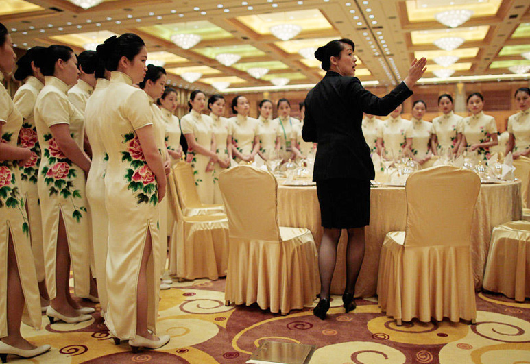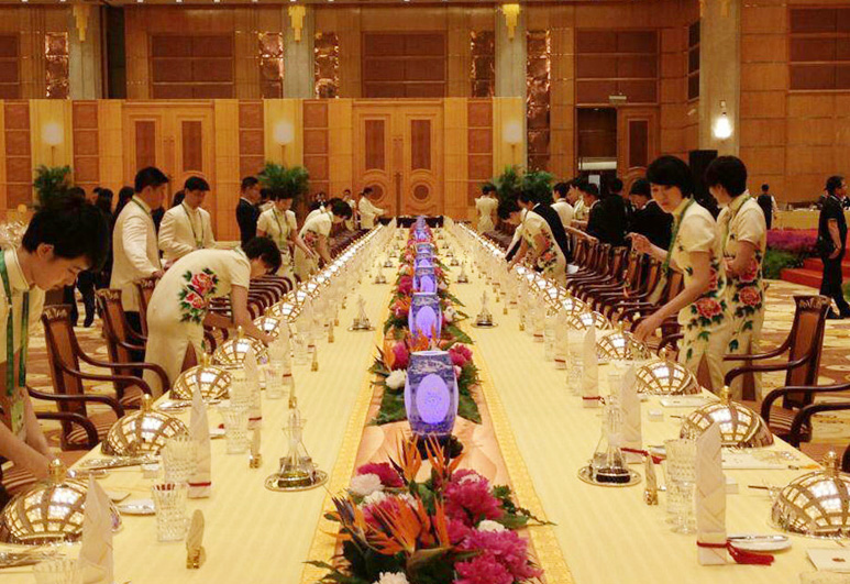 2014年5月20日,上海举行亚洲相互协作与信任措施会议第四次峰会。俄罗斯总统弗拉迪米尔-普京出席2014上海亚信峰会欢迎晚宴,被美女礼仪服务小姐吸引。
