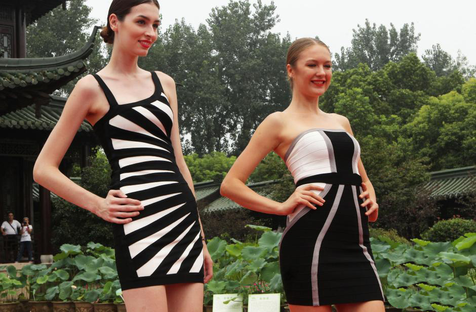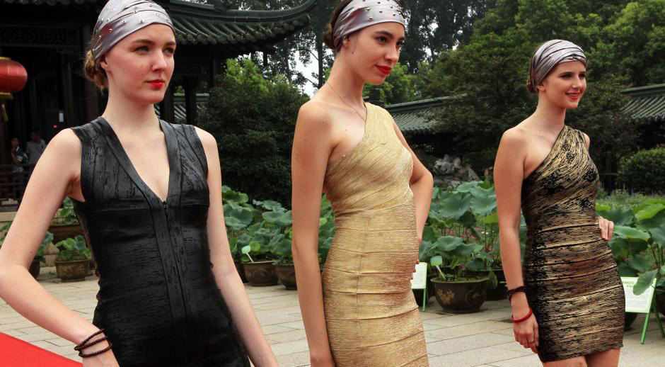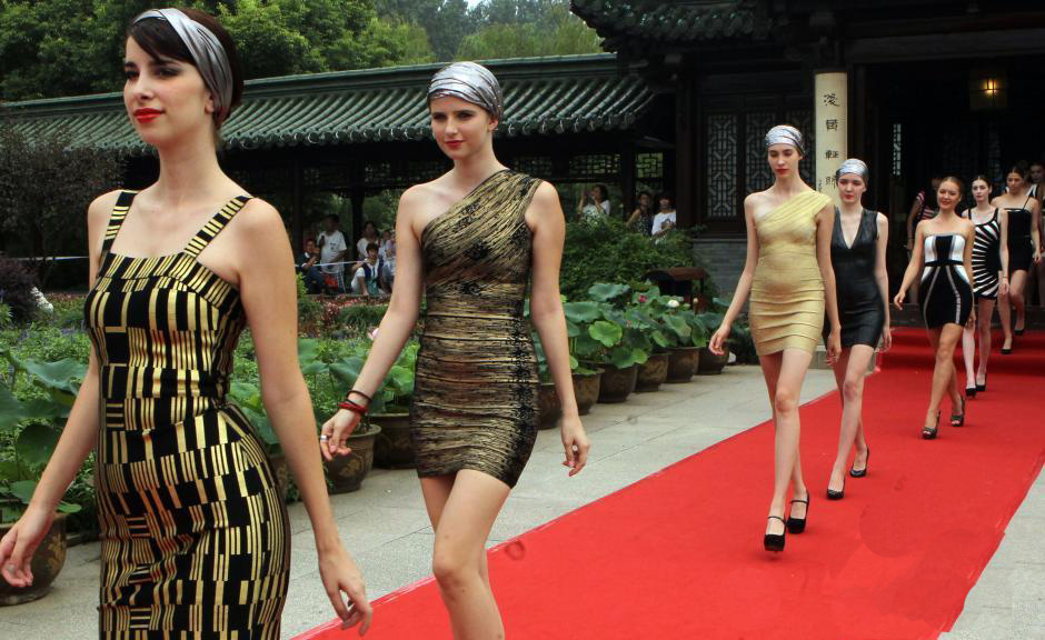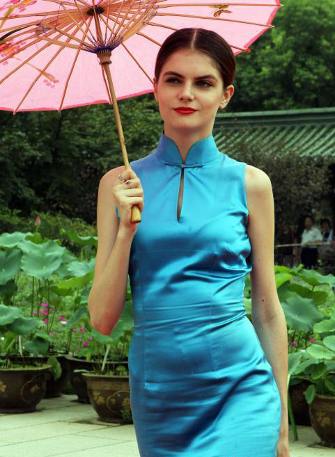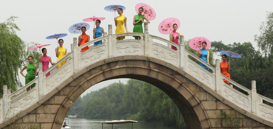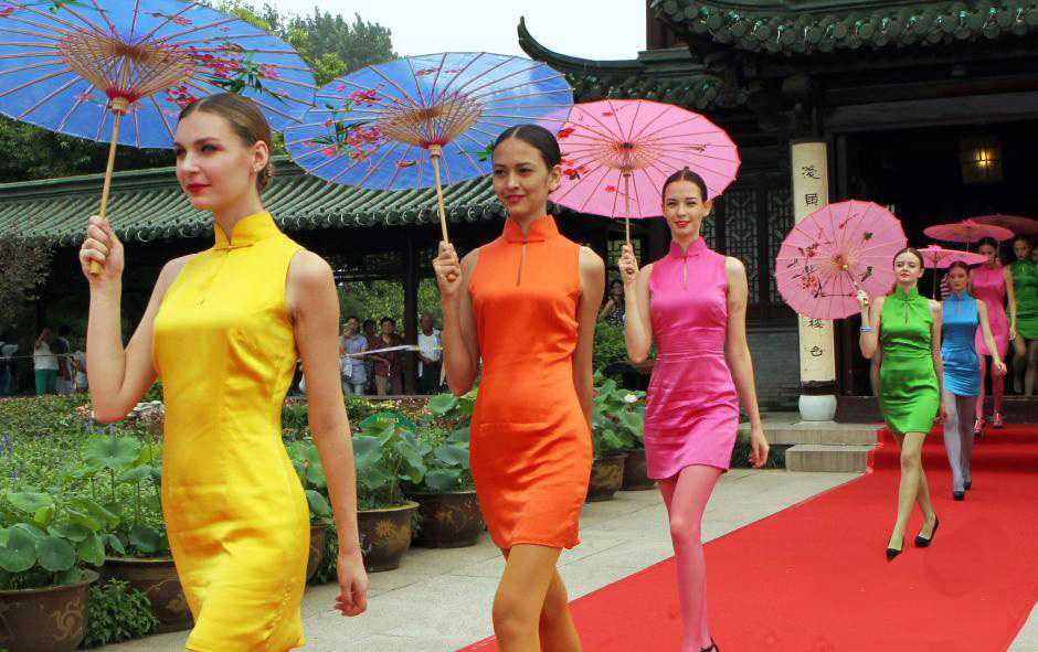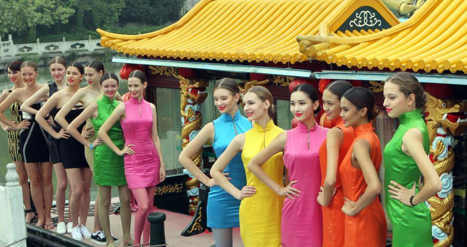 8月16日,正在江苏扬州参加2014新丝路国际旅游形象大使大赛的各国模特,来到扬州美丽的风景区瘦西湖为假日游客上演一场精彩的旗袍秀。