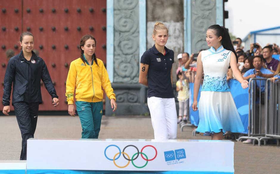 8月17日,在南京举行的第二届夏季青年奥林匹克运动会颁奖仪式上,青奥会礼仪颁奖志愿者、旗手着颁奖礼服亮相,蓝白相间好似青花瓷,配上胸前印着的南京市市花,造型上采用旗袍领和中华立领,体现中国传统服装中最有民族特色的两个元素,柔和淡雅又不失华丽,十分抢眼。