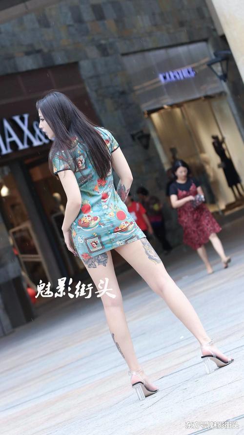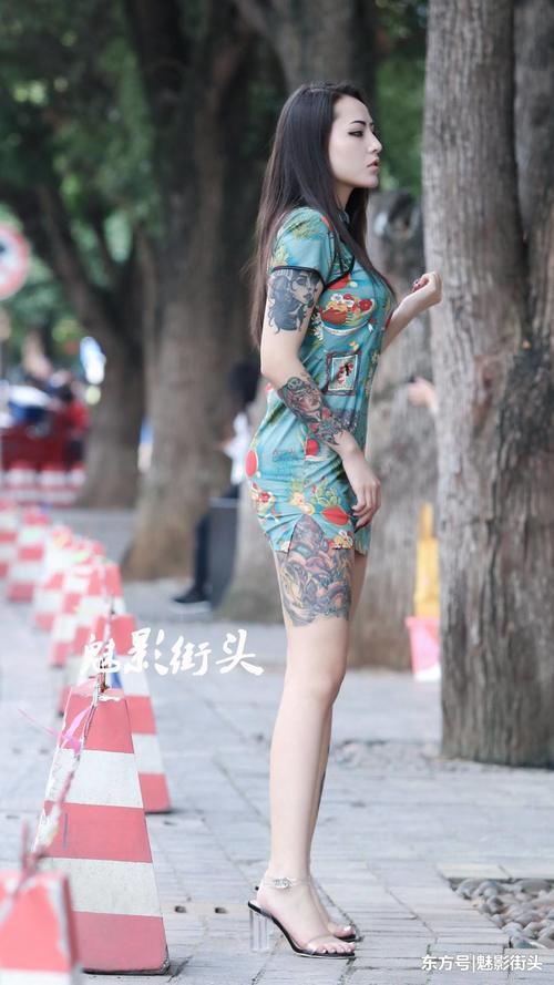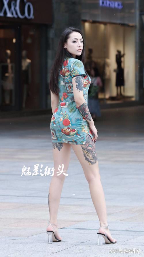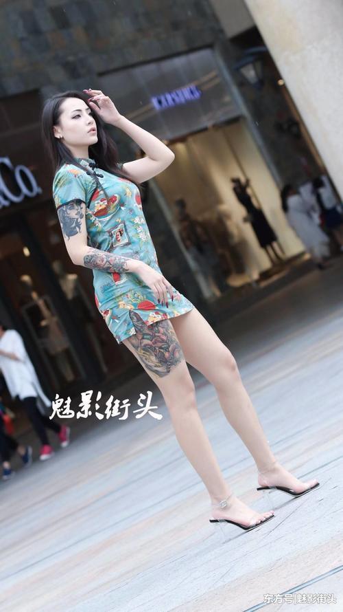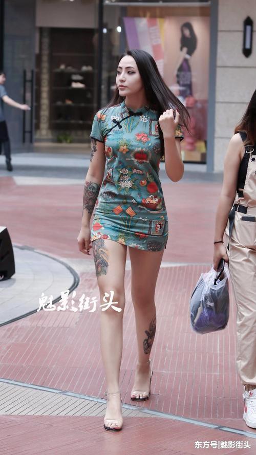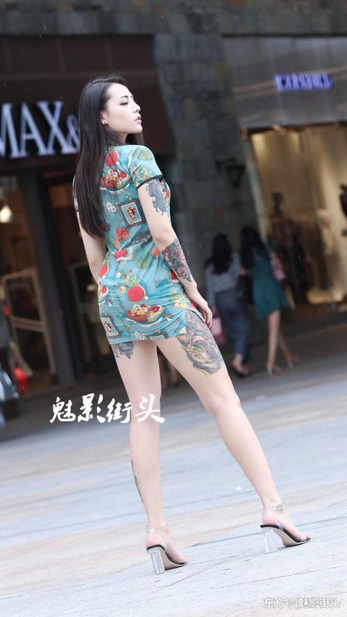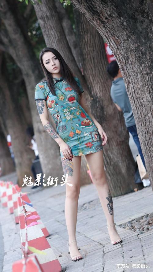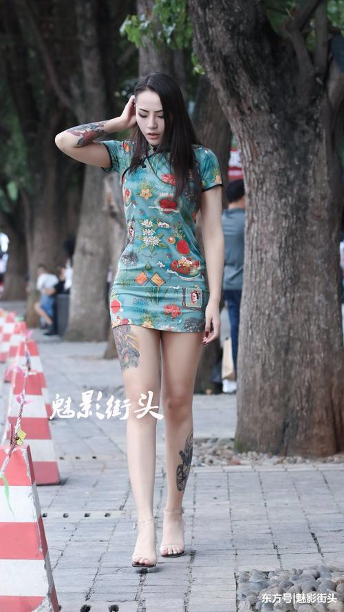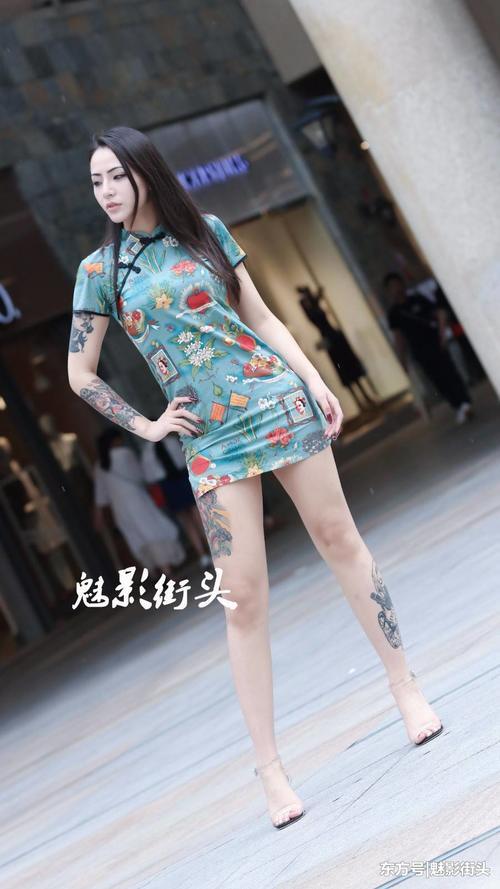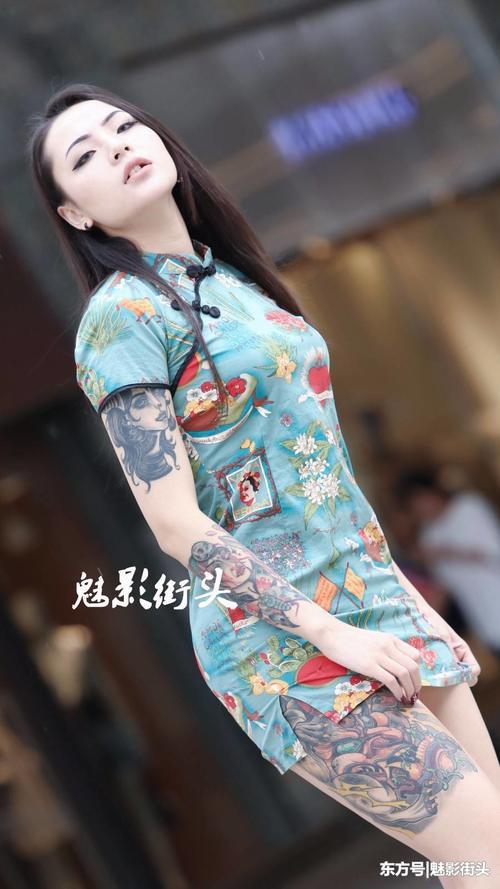 绿色印花改良版旗袍穿出紧致好身材,霸气的纹身充满了时尚元素