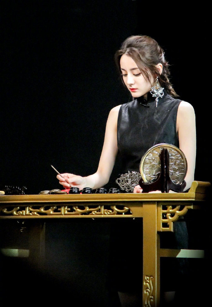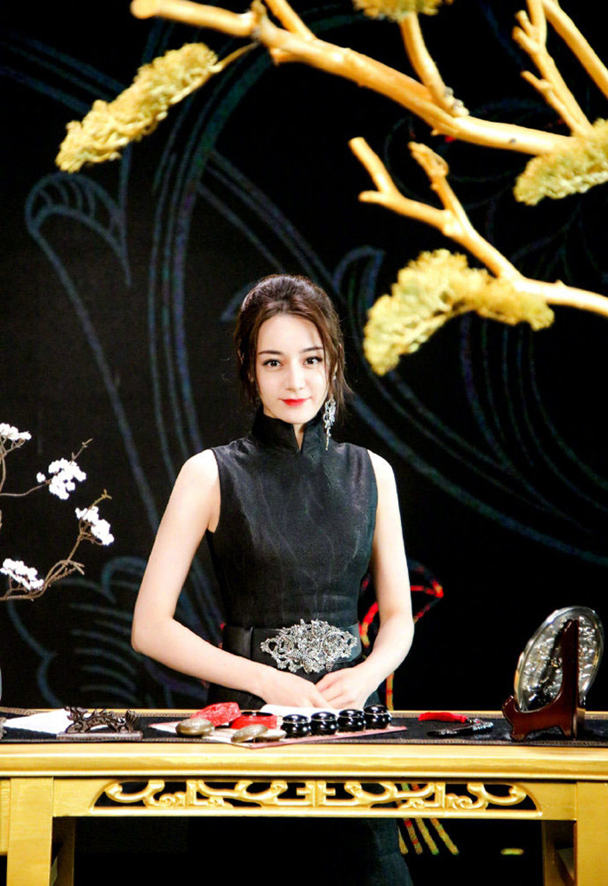迪丽热巴身穿黑色旗袍、梳麻花辫,展示东方女性之美