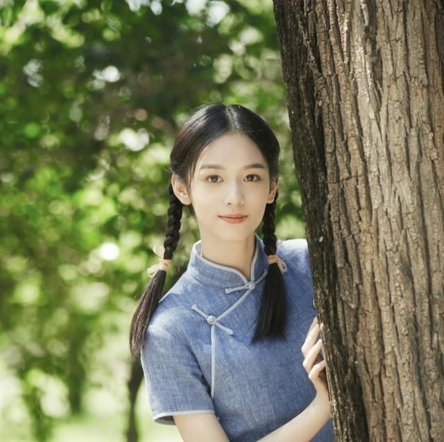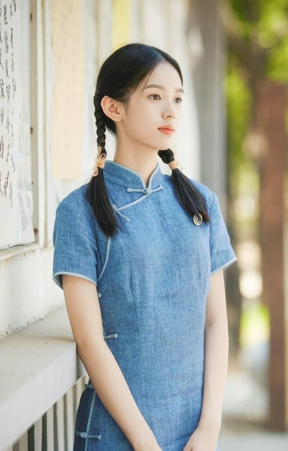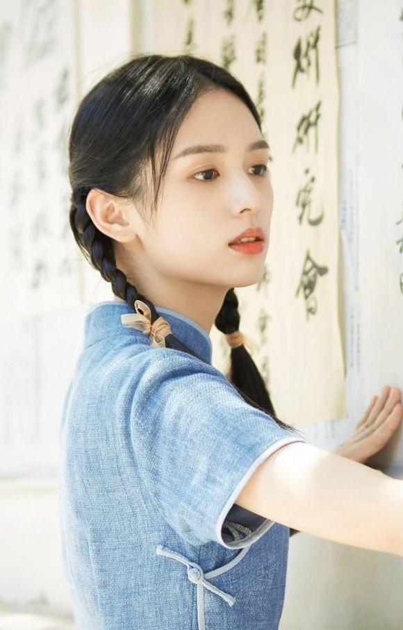 周也身穿旗袍扎着马尾辫,清新脱俗
